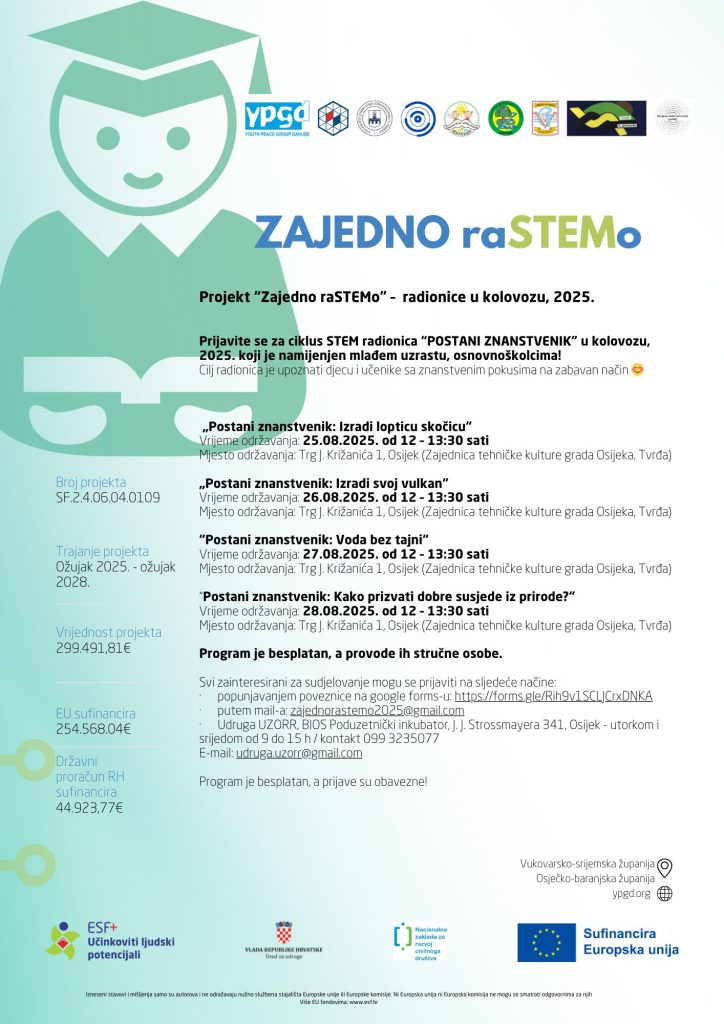 Aktivnost se provodi u sklopu projekta “Zajedno raSTEMo”, broj projekta: SF.2.4.06.04.0109, sufinanciranom sredstvima Europske unije iz Europskog socijalnog fonda plus, Učinkoviti ljudski potencijali u okviru poziva “Jačanje kapaciteta organizacija civilnog društva za promociju STEM-a” pokreću se ciklusi provedbe radionica u Vukovarsko-srijemskoj županiji i Osječko-baranjskoj županiji za ciljnu skupinu učenika u razdoblju od ožujka 2025- ožujka 2028.