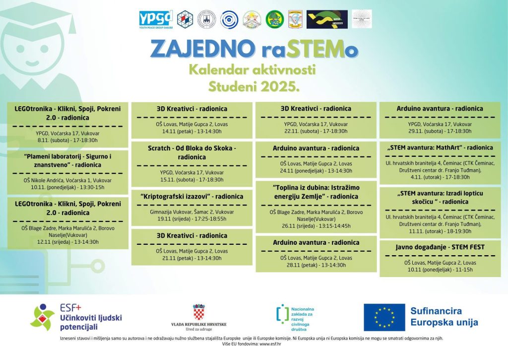 U sklopu projekta “Zajedno raSTEMo”, broj projekta: SF.2.4.06.04.0109, sufinanciranom sredstvima Europske unije iz Europskog socijalnog fonda plus, Učinkoviti ljudski potencijali u okviru poziva “Jačanje kapaciteta organizacija civilnog društva za promociju STEM-a” nastavljamo s provedbom radionica i u studenom 2025 u Vukovarsko-srijemskoj županiji i Osječko-baranjskoj županiji za ciljnu skupinu učenika.