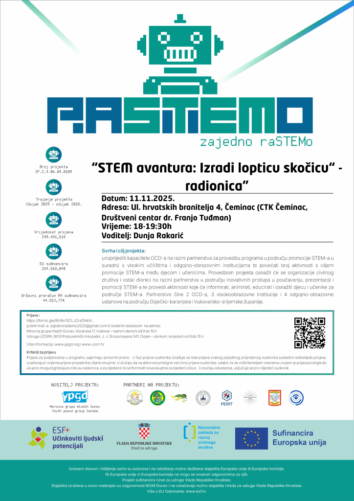 Cilj projekta je unaprijediti kapacitete OCD-a na razini partnerstva za provedbu programa području promocije STEM-a u suradnji s visokim učilištima i odgojno-obrazovnim institucijama te povećati broj aktivnosti s ciljem promocije STEM-a među djecom i učenicima. Provedbom projekta osnažit će se organizacije civilnog društva i ostali dionici na razini partnerstva u području inovativnih pristupa u poučavanju, prezentaciji i promociji STEM-a te provesti aktivnosti koje će informirati, animirati, educirati i osnažiti djecu i učenike za područje STEM-a.