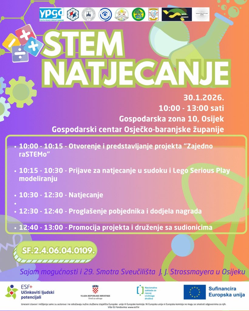 Dana 30. siječnja 2026. godine održat će se javno događanje – STEM natjecanje u okviru Sajma mogućnosti i 29. smotre Sveučilišta Josipa Jurja Strossmayera u Osijeku. Događanje će biti organizirano u Gospodarskom centru Osječko-baranjske županije, Gospodarska zona 10, Osijek. Posjetite nas na štandu, prijavite se za natjecanje te saznajte sve o budućim projektnim aktivnostima i uključite se ![]()